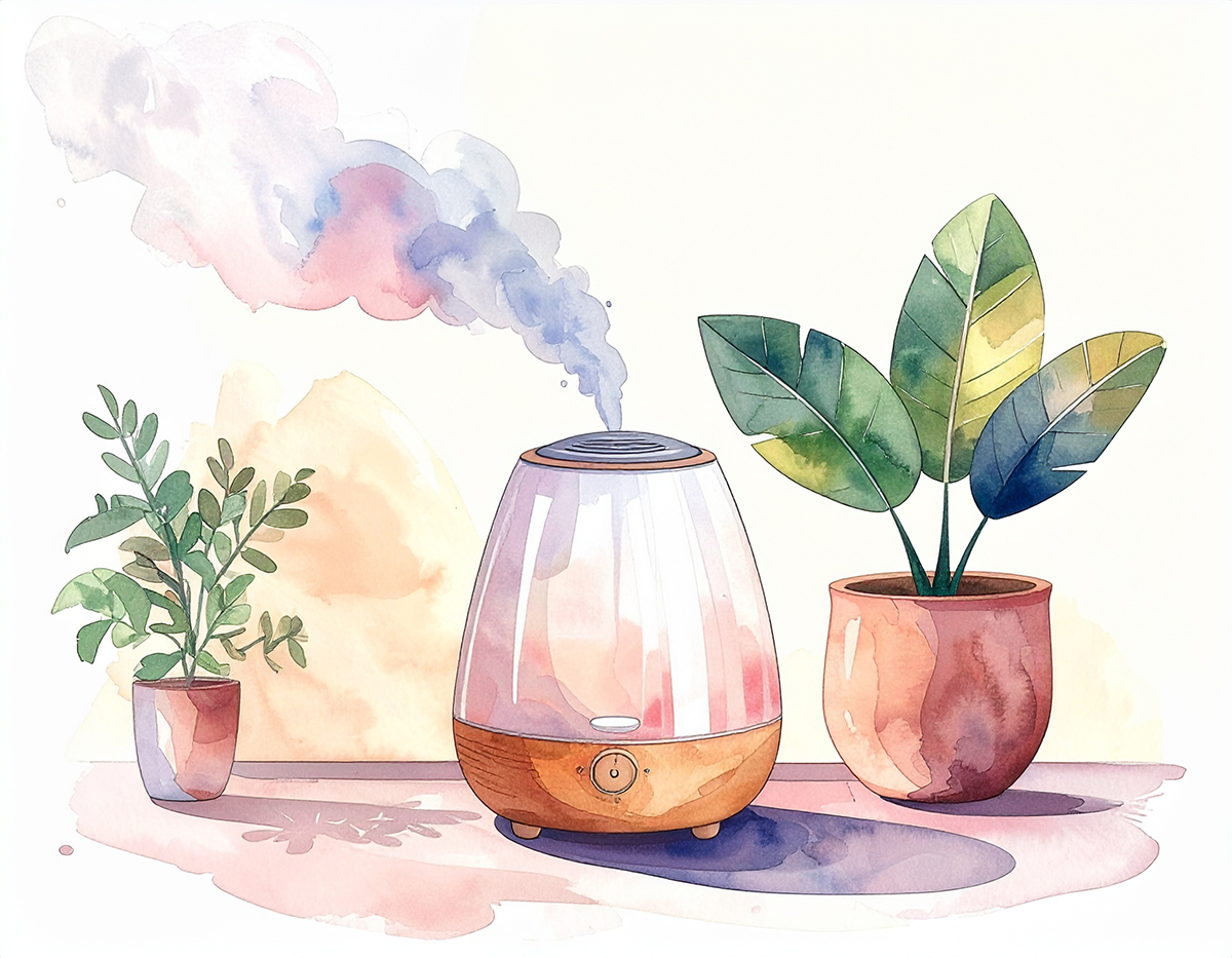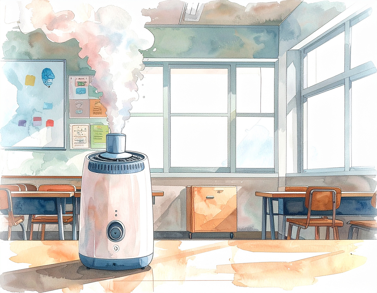【無料・商用OK】集団生活を守る水彩タッチの「加湿器」イラスト(学校・教室・塾向け)