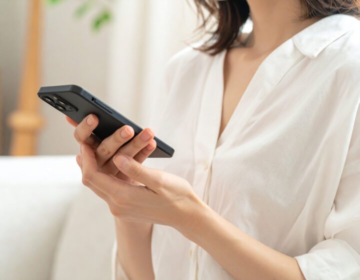 柔らかな光が差し込むリビングのソファで、20代〜30代の日本人女性がスマートフォンを操作している日常のワンシーンです。 清潔感のある白いVネックブラウスと、天然素材のような風合いのベージュのボトムスが、洗練された「大人のナチュラルスタイル」を演出しています。 背景の白い壁と柔らかな布地の質感が、オーガニックで落ち着いた暮らしの空気感を強調。 顔全体を映さない構図により、ユーザーが「自分自身の心地よい時間」としてイメージを投影しやすく、ライフスタイルに寄り添ったコンテンツに自然に溶け込みます。