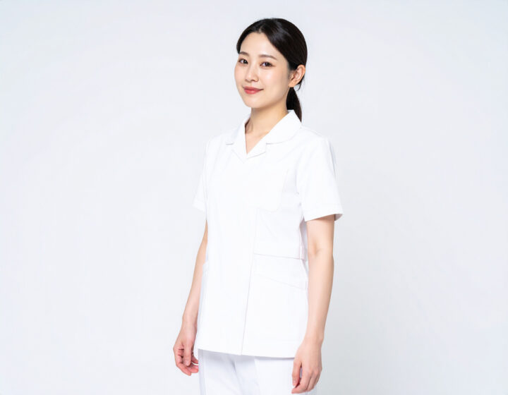 白を基調とした清潔感あふれる院内廊下を背に、穏やかな微笑みを浮かべる日本人女性看護師の人物素材です。肌馴染みの良い淡いピンクベージュのユニフォームを着用しており、医療現場のプロフェッショナルな空気感の中に、親しみやすさと柔らかい印象を添えています。