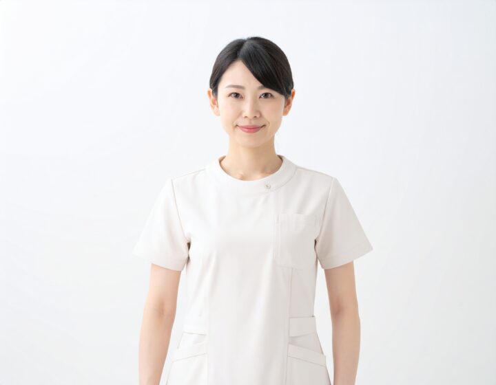 余計な映り込みのないシンプルな白い壁を背景にした、日本人女性看護師の人物素材です。クリーンな白いユニフォームを着用し、正面で丁寧に手を重ねて微笑む姿は、誠実さと清潔感の塊のような安定した美しさがあります。