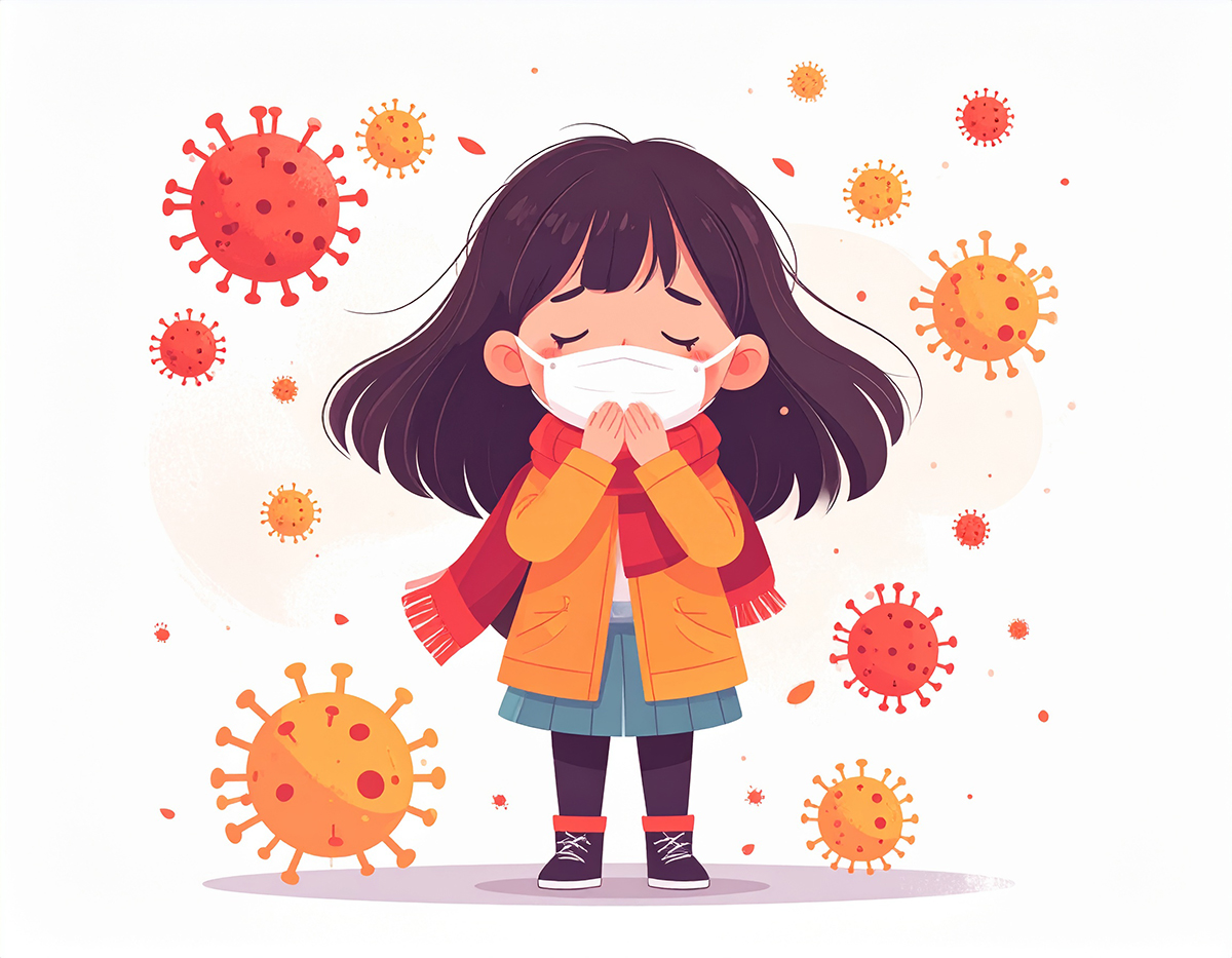 インフルエンザの流行期が近づく中、このイラストは温かい冬服を着た10歳ぐらいの女の子を主人公に、予防の模範となる姿を描いています。マスクをして少しせき込んでいる様子と、周囲に漂う小さなウイルスは、「自分から進んで予防しよう」という前向きな意識を表現しています。