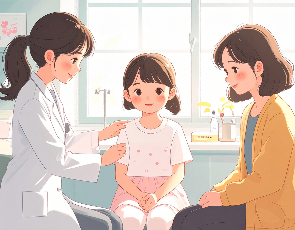 - 医療と家族の連携: 女性医師と母親が寄り添う構図は、医療機関と家庭が連携して子供の健康を守っているという強い信頼関係を視覚化しています。