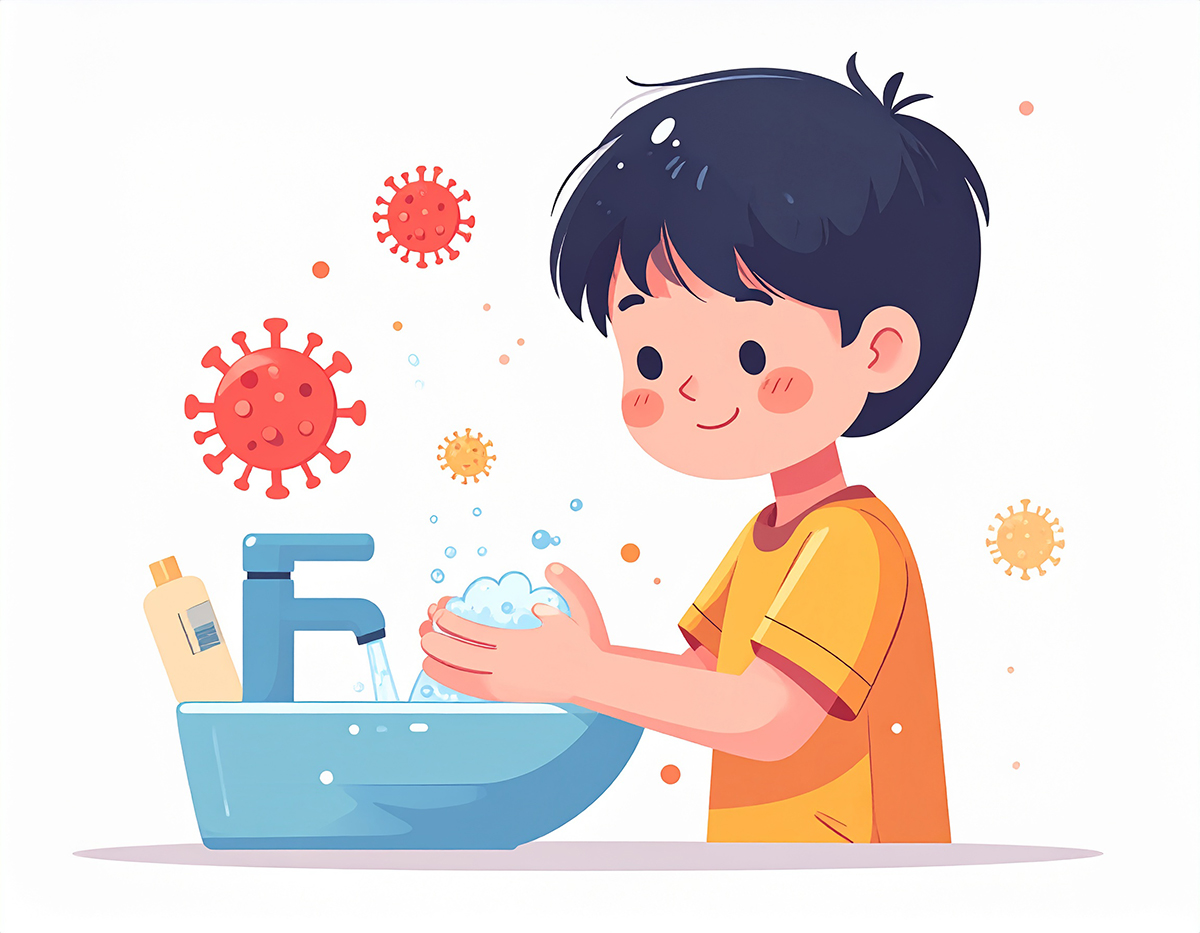 この【手洗い習慣】イラストは、「手洗いは一番効果的な予防だよ」というシンプルなメッセージを、親しみやすいビジュアルで伝えます。