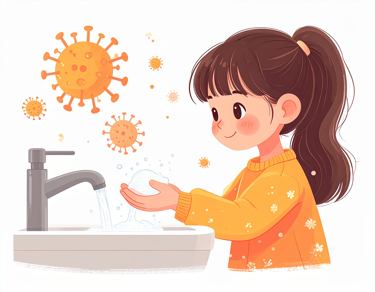 手洗い習慣は、子供たちがお互いにお手本となって広がるものです。この女の子のイラストは、その「お手本」としての役割を優しく担います。