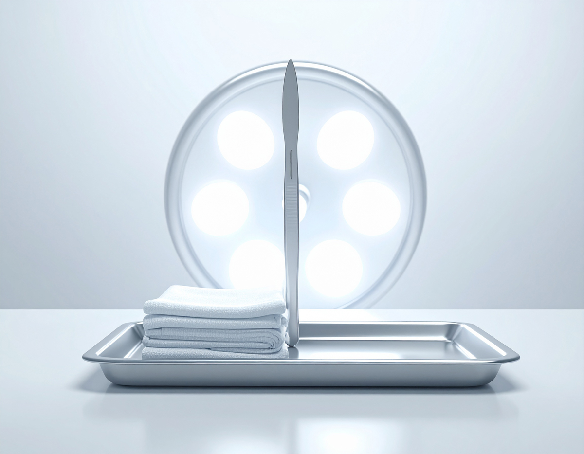 - ドラマチックな光の演出: バックライトとしての無影灯の光は、メスなどの器具にドラマチックなハイライトを与え、そのプロフェッショナルな質感を強調します。Webサイトのキービジュアルとして、高い訴求力を発揮します。