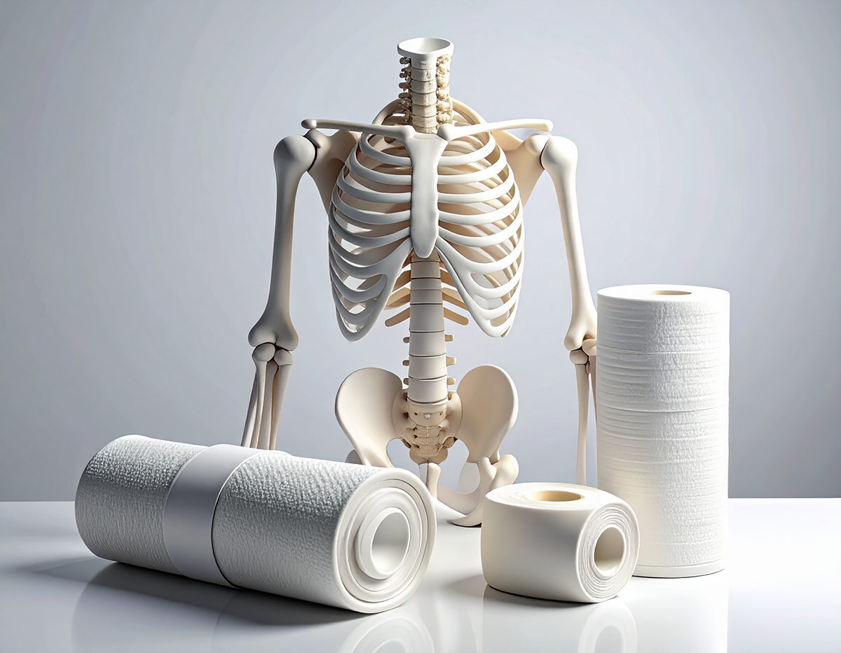 - 包帯(損傷と回復のプロセス): 骨格模型の周りに配置された包帯は、「損傷を保護し、治療・リハビリを通じて回復に向かう」というプロセス全体を表現しています。これは、「治療が終われば終わりではない。機能回復まで寄り添う」という貴院の包括的なケア姿勢を伝えます。