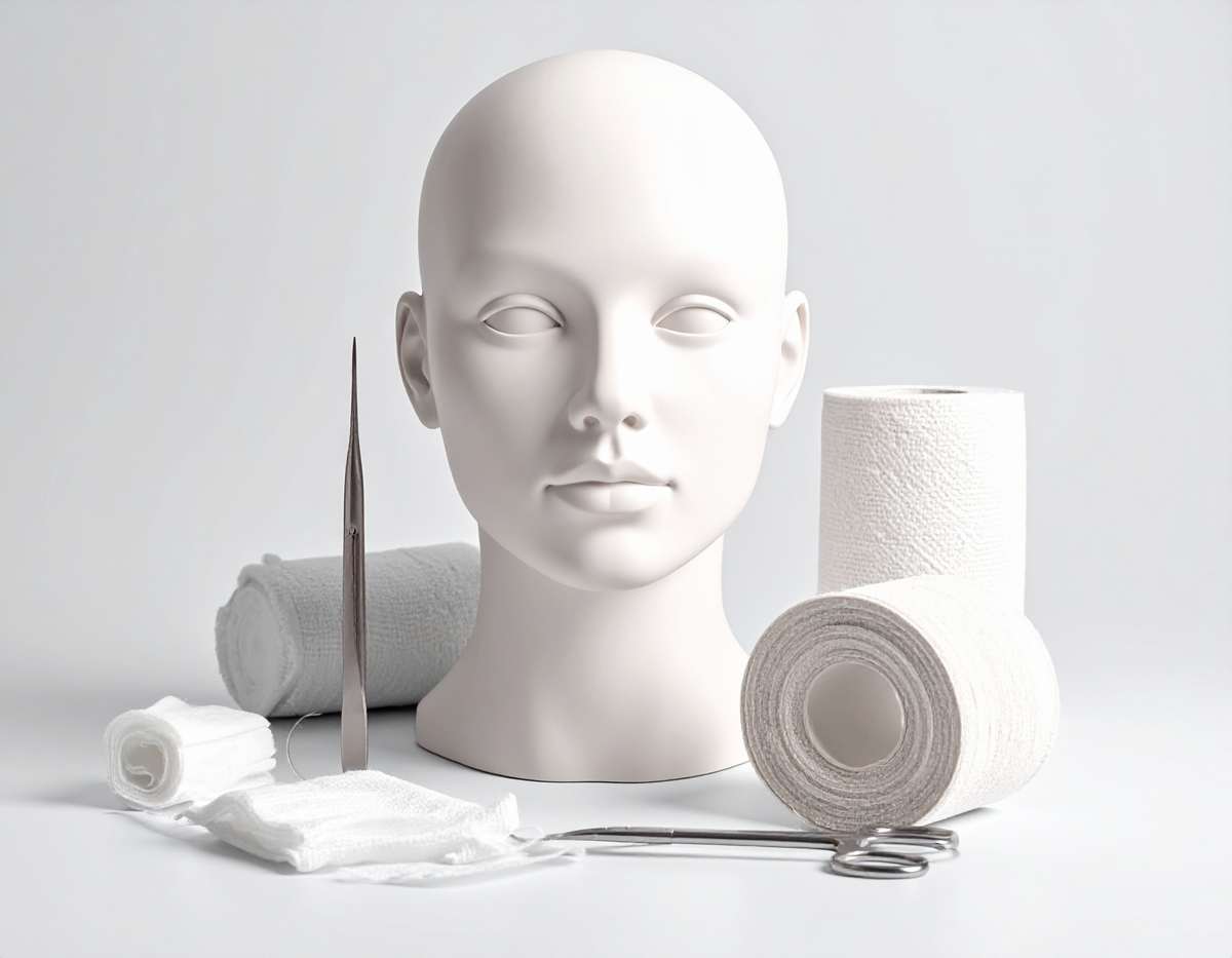 - 女性の顔マネキン(修復と美の対象): 中央の白色の顔マネキンは、形成外科が扱うデリケートな「顔」という部位と、患者様が求める「美しさ」を象徴しています。髪の毛がないことで、顔全体の皮膚、組織、輪郭といった部位を総合的に診るという専門性を強調しています。