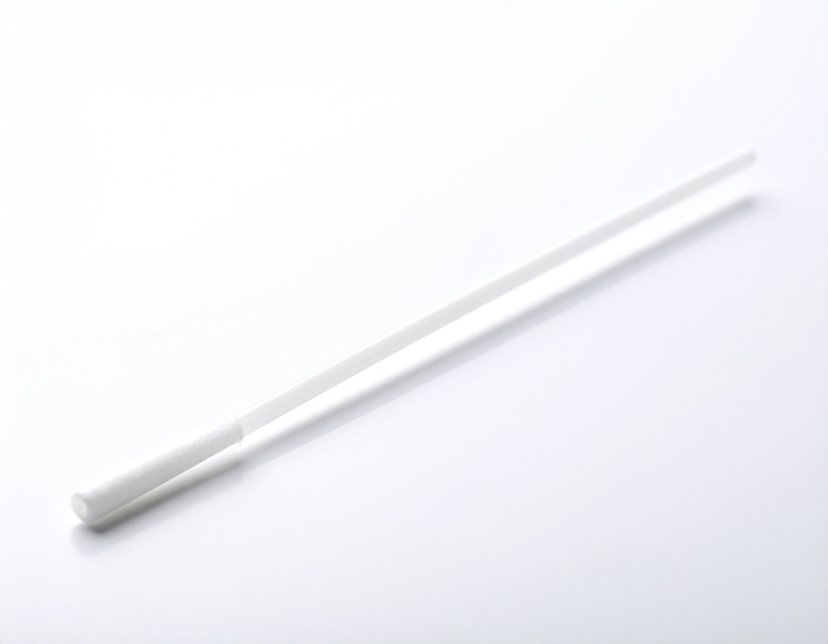 この白色のフォームチップは、繊維くずが出ない(リントフリー)特性を持ち、精密な検査やクリーンルームでの作業に適しています。この画像素材は、感染管理の徹底、検体採取の正確性、そして高度な衛生基準が求められる医療および産業の現場を象徴しています。
