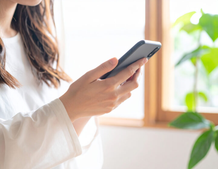 【無料・商用OK】スマートフォンを持つ女性の手元(30代〜40代・明るい室内・清潔感)
